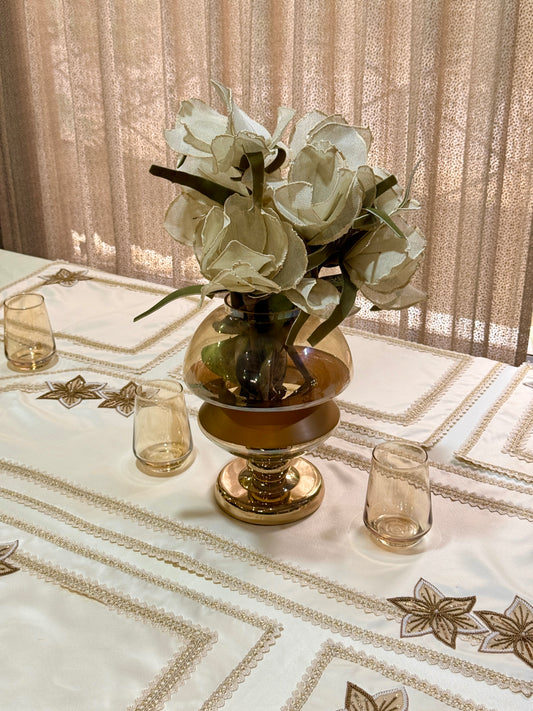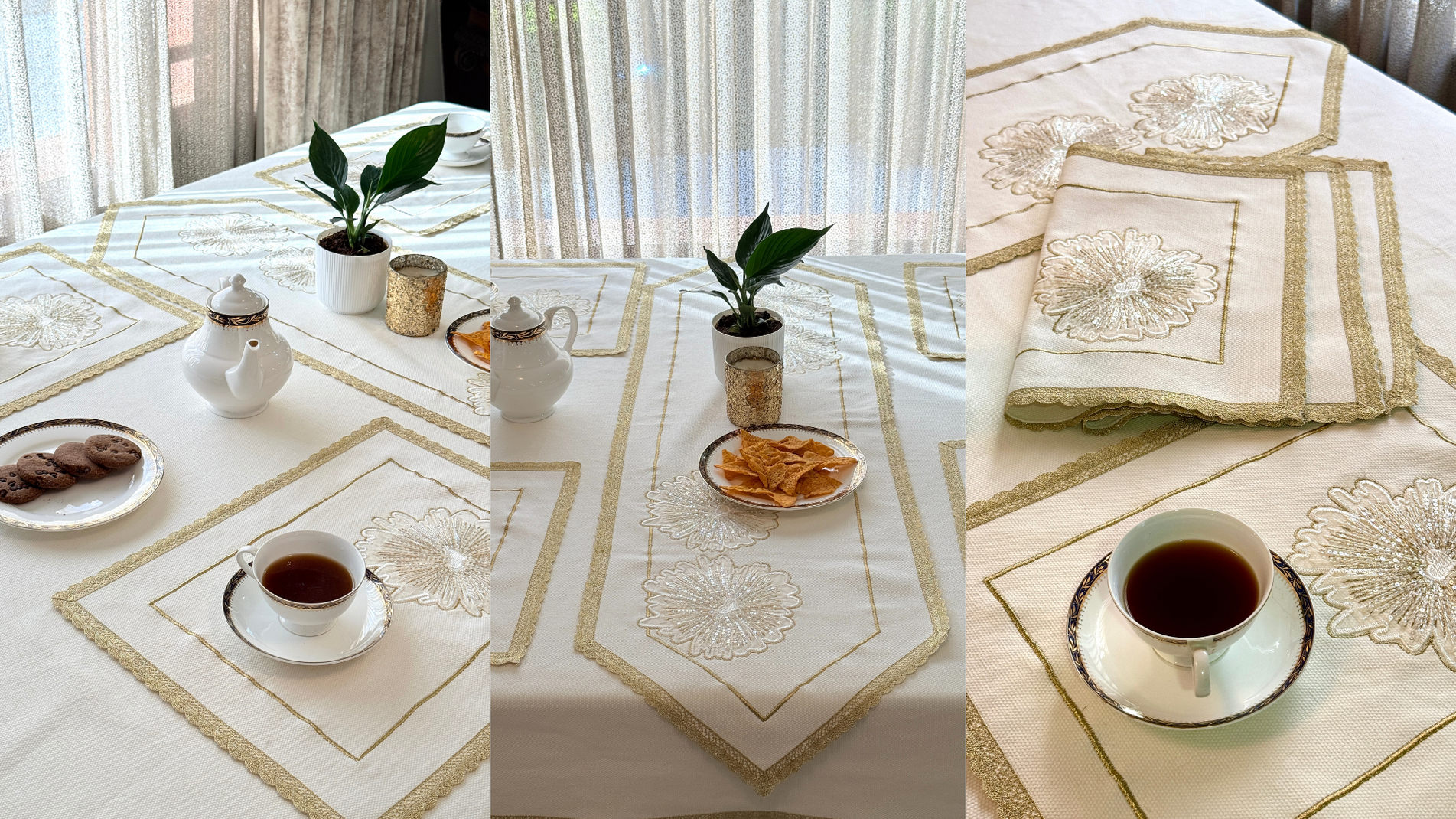 When shimmer meets sheer elegance Crafted from fine organza, this set shimmers with a soft metallic glow that feels effortlessly regal. Its translucent fabric and radiant finish lend an exclusive charm, turning your table into a vision of sophistication. Perfect for celebrations, it's where subtle luxury meets timeless beauty. Detail...