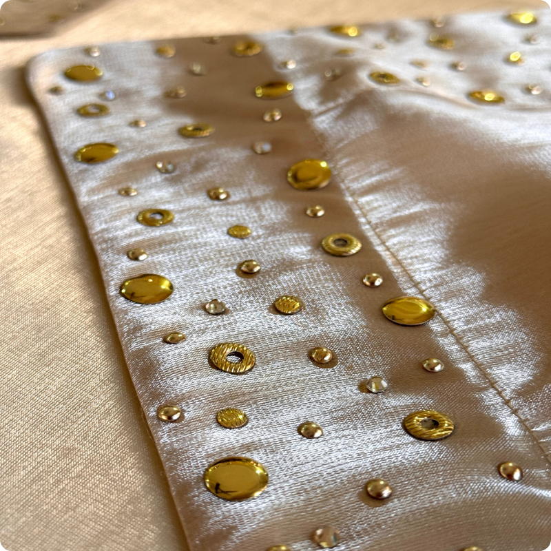 Where subtle shimmer meets delicate charm. The Gleam Stripes Organza Mat features elegant gold and silver horizontal lines woven across a sheer organza base, giving it a soft, luminous shimmer. Finished with a delicate floral lace border accented by a single stud, it strikes the perfect balance between subtle beauty...