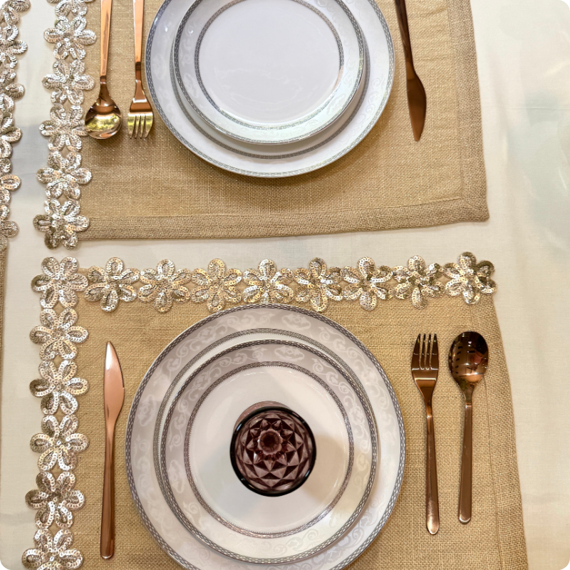 Where elegance blooms on a golden vine. Crafted in natural jute and adorned with a shimmering vine of sequin flowers, this set adds a royal charm to your table. Prefect for celebrations, it blends warmth, beauty and festive sparkle - making every gathering feel special. Detail : Colour - Golden...