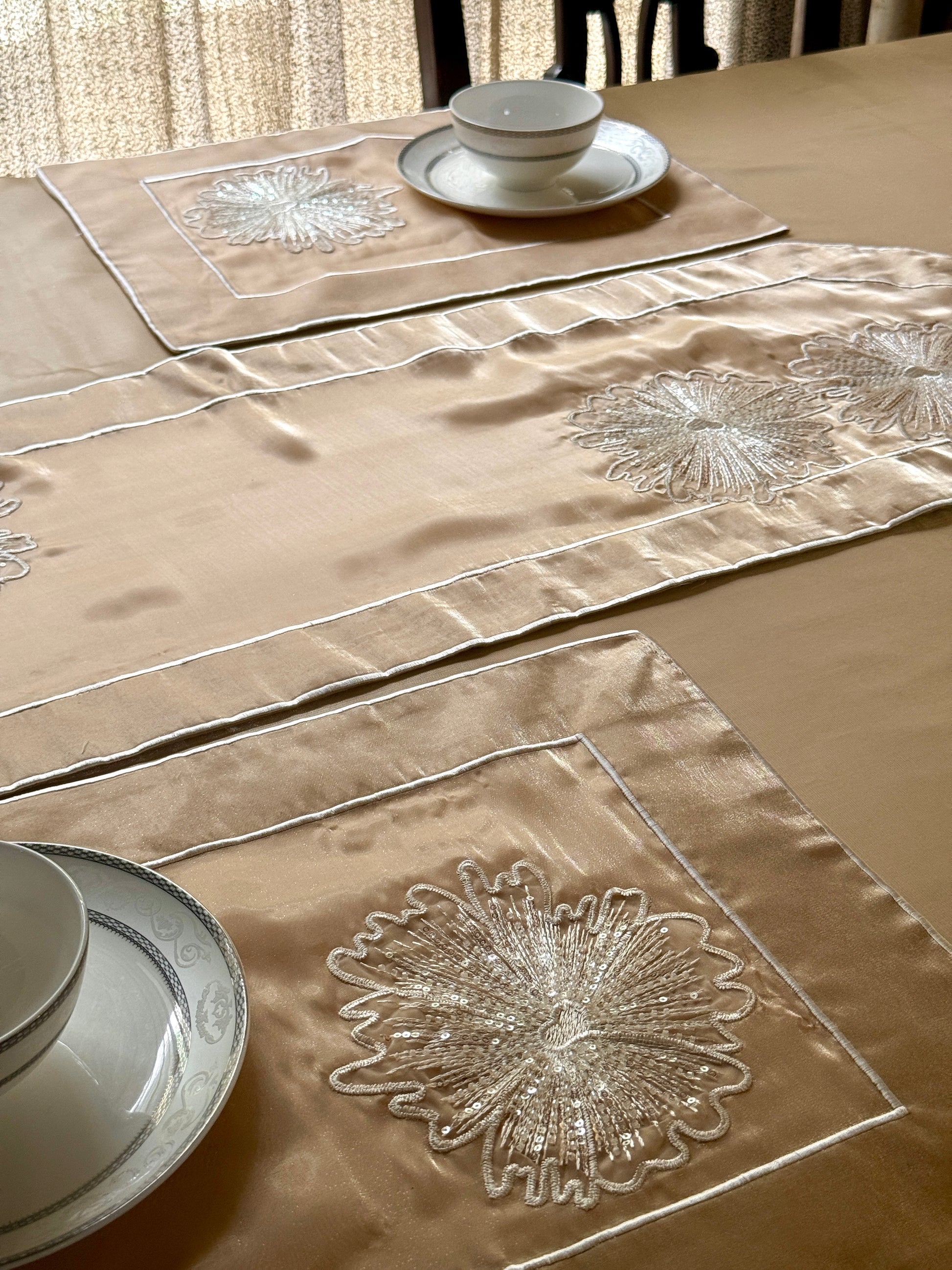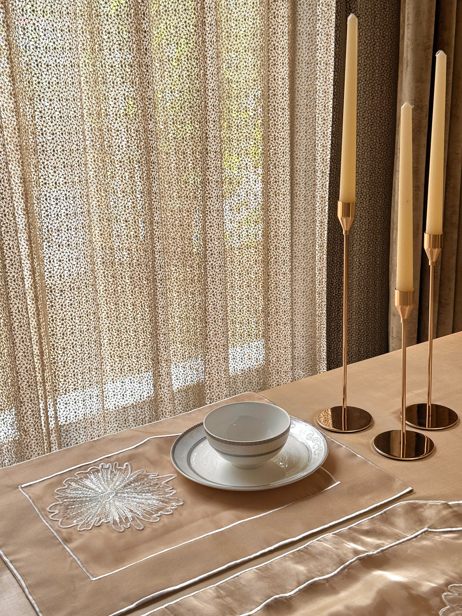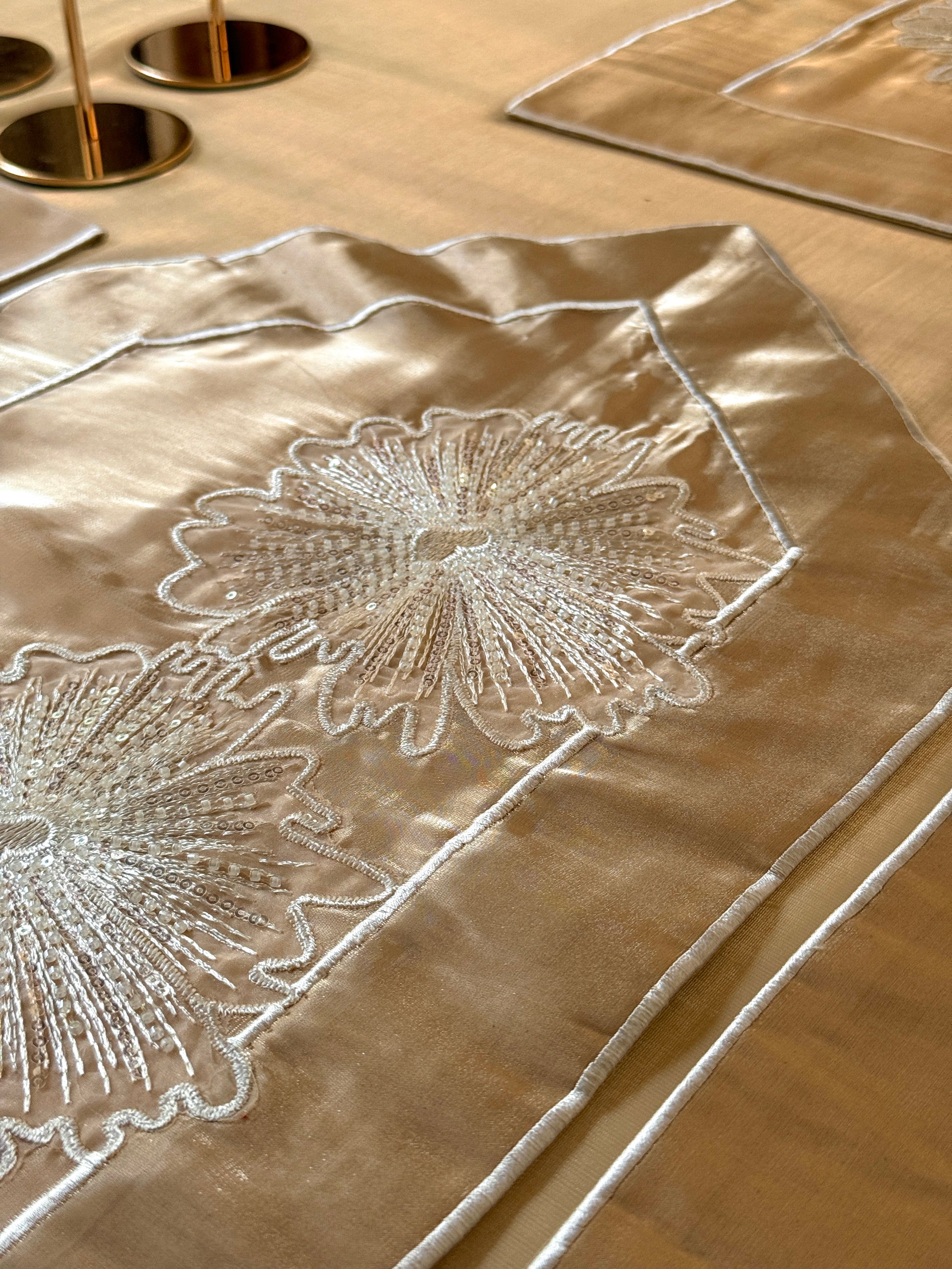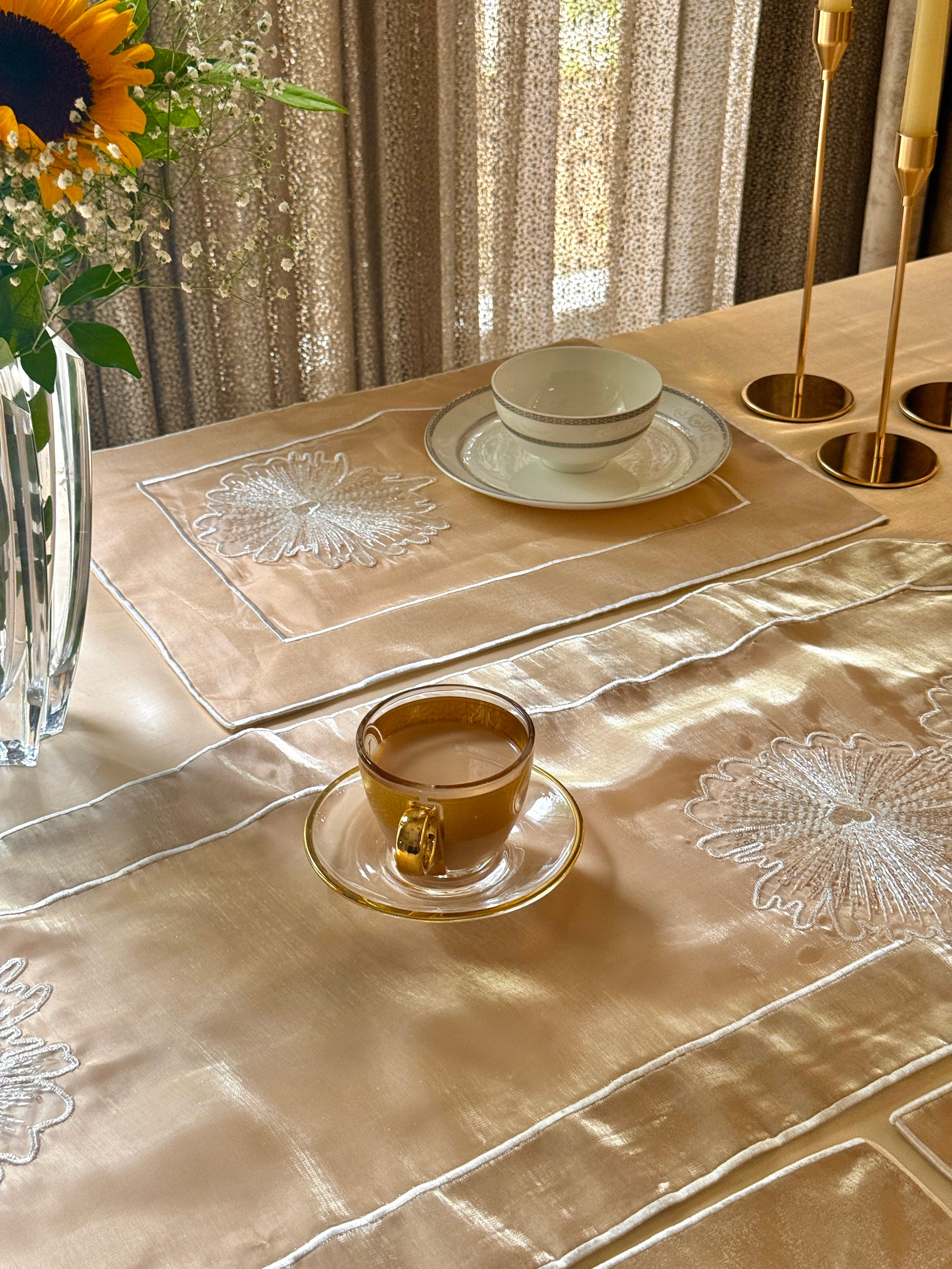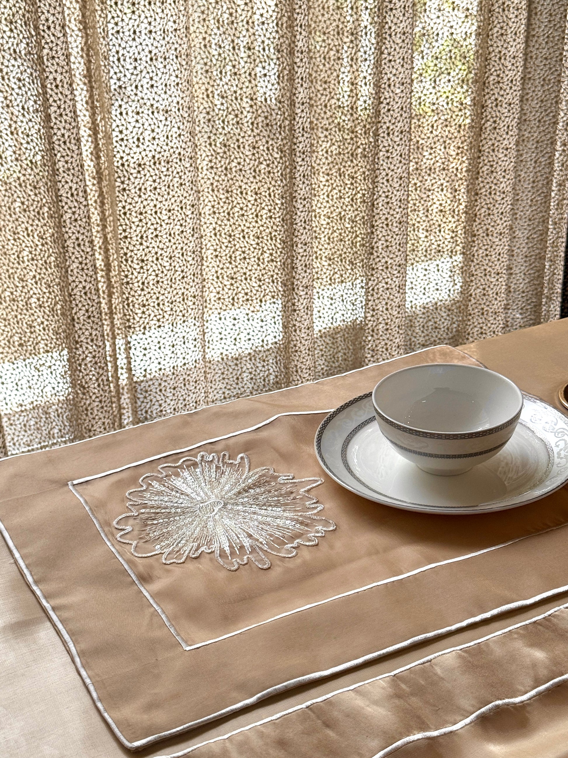 A piece of elegant drape that brings sophistication to every meal. Adorned with a white hand - embroidered flower and subtle beadwork, this organza placemat & runner carries a soft, airy charm. Finished with delicate handwork, it blends artistry and refinement - perfect for everyday dining or festive occassions.
