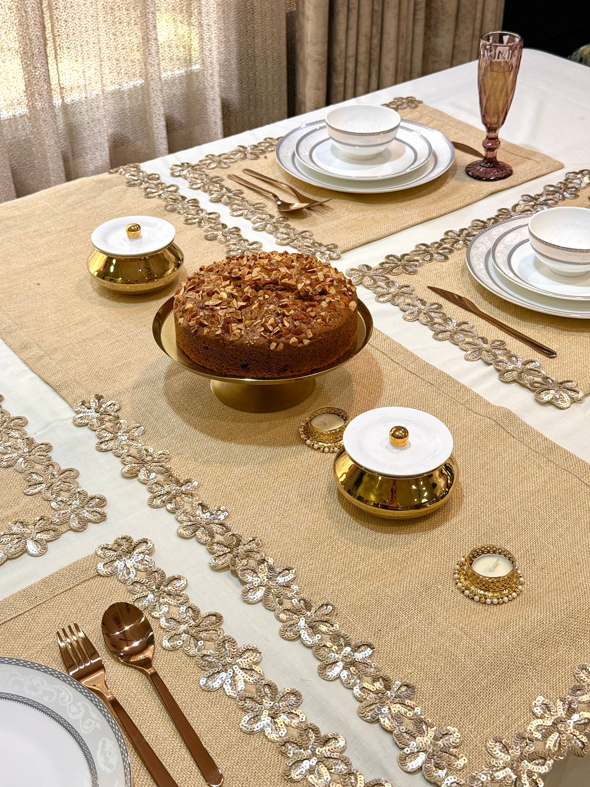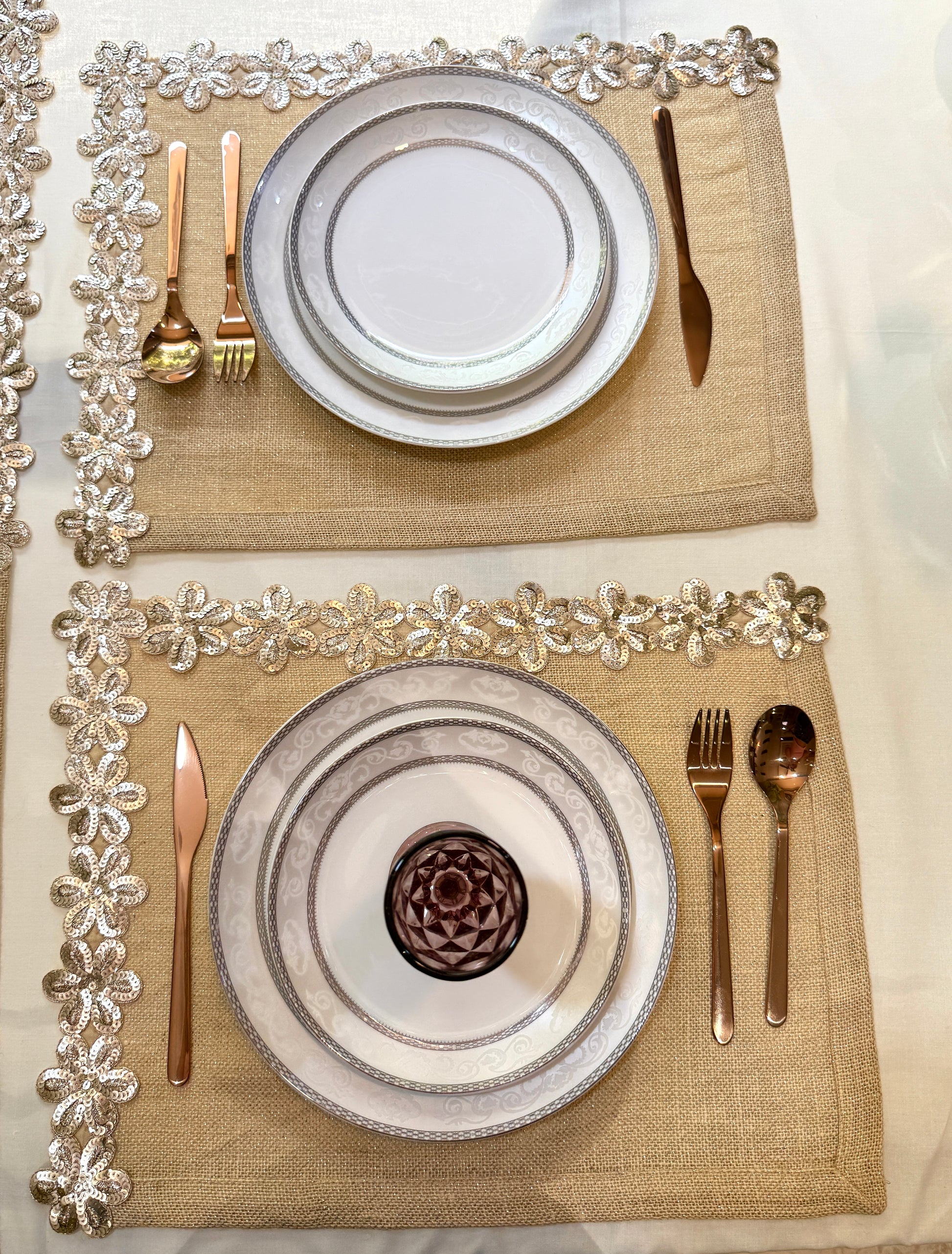 Crafted in natural jute and adorned with a shimmering vine of sequin flowers, this set adds a royal charm to your table. Prefect for celebrations, it blends warmth, beauty and festive sparkle - making every gathering feel special.
