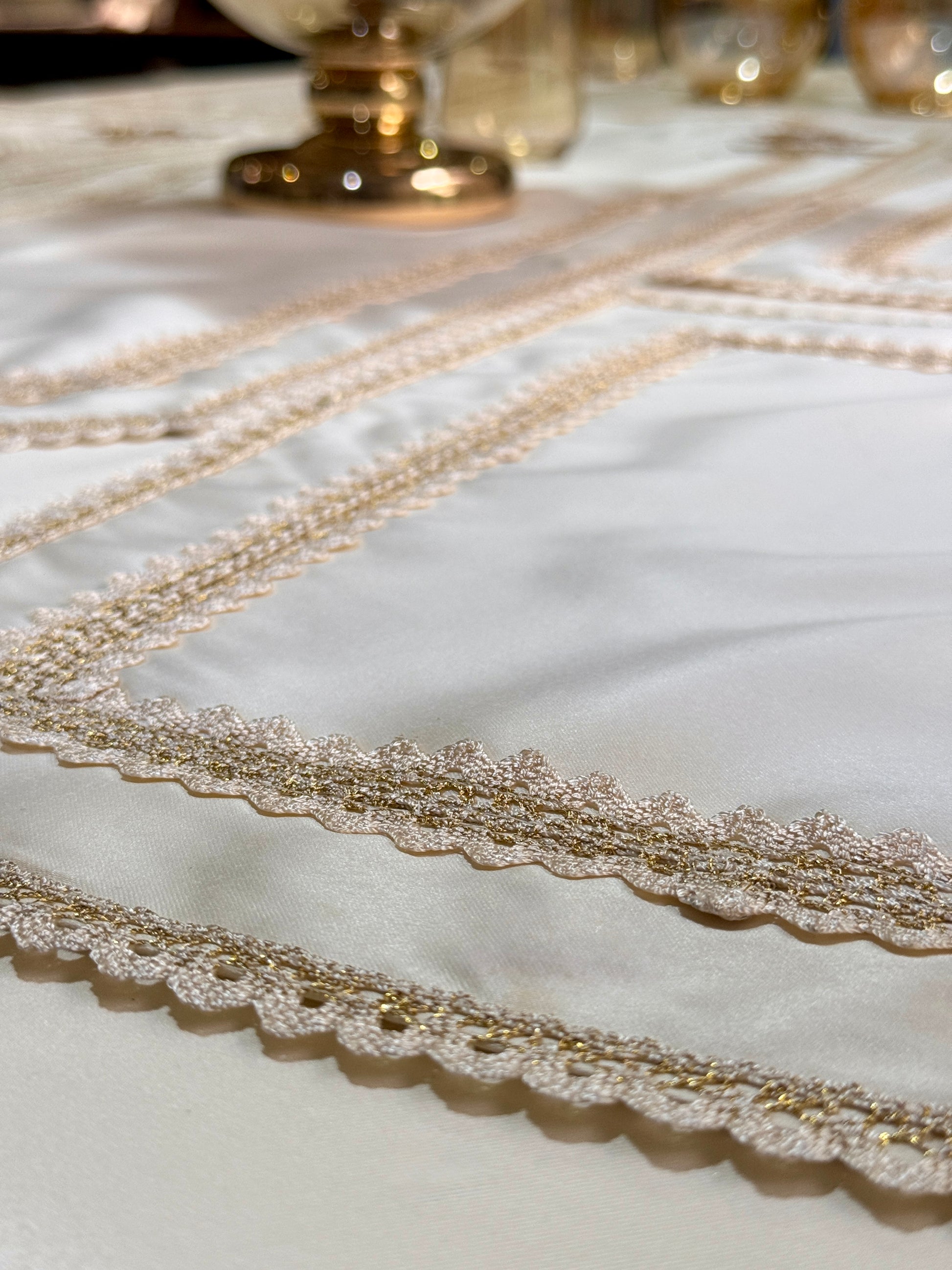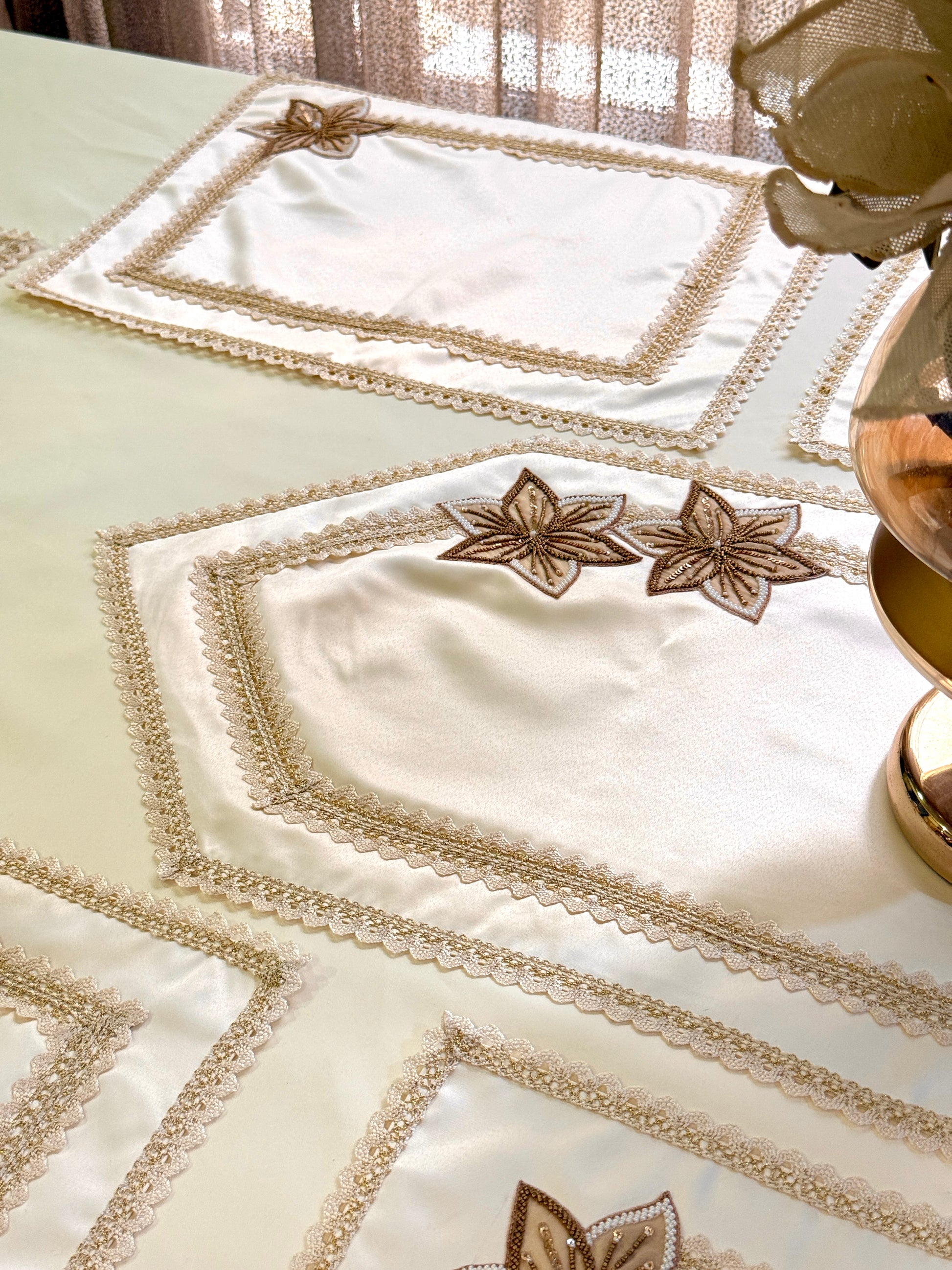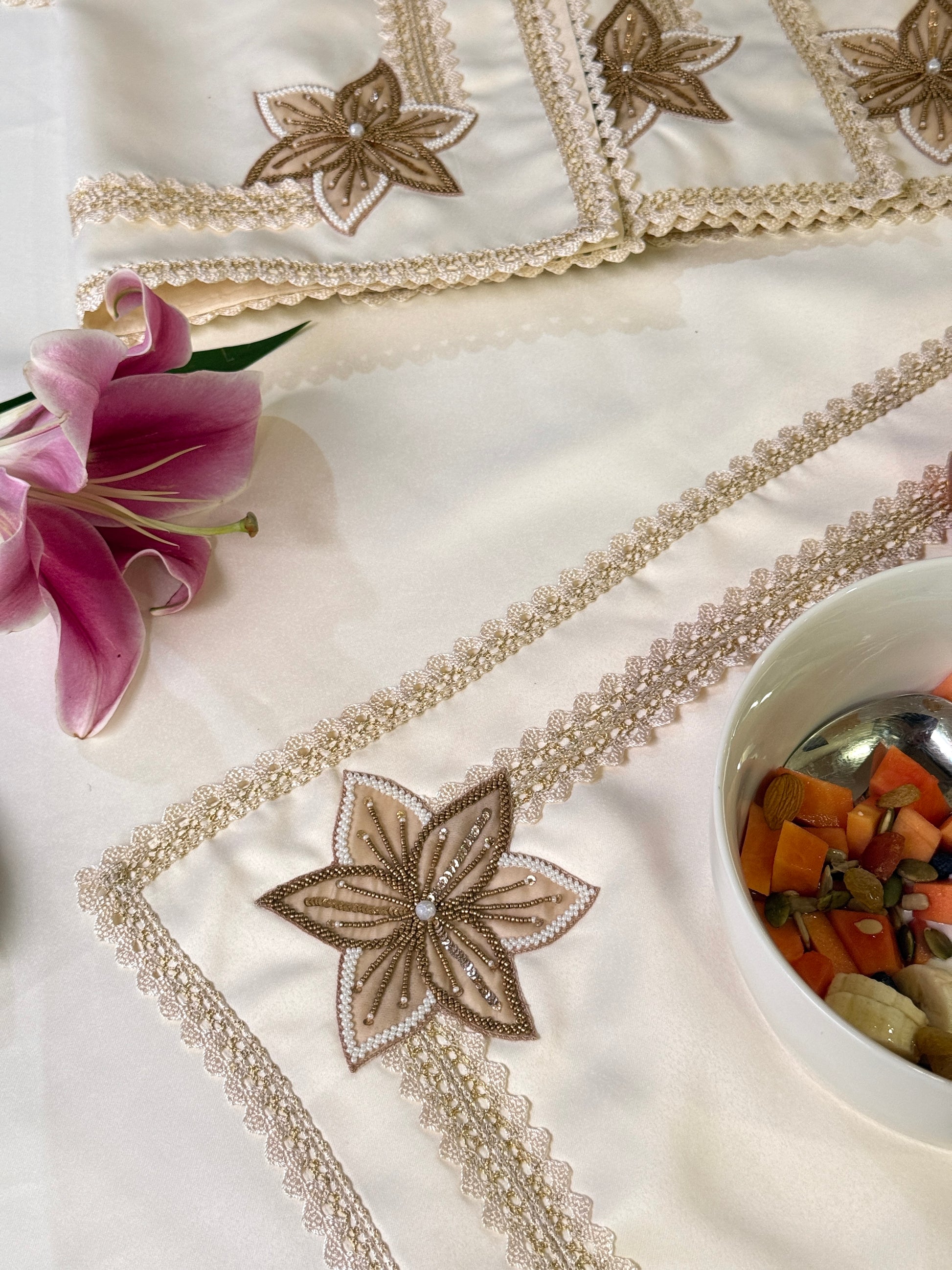 Crafted with love, silk aurora placemats feature delicate hand embroidery enriched with fine bead detailing and graceful lace accents. The intricate white floral motif, highlighted with shimmering beads, adds a subtle sparkle that enhances its charm. Each piece blends tradition with refined artistry, transforming every meal into a cherished memory.