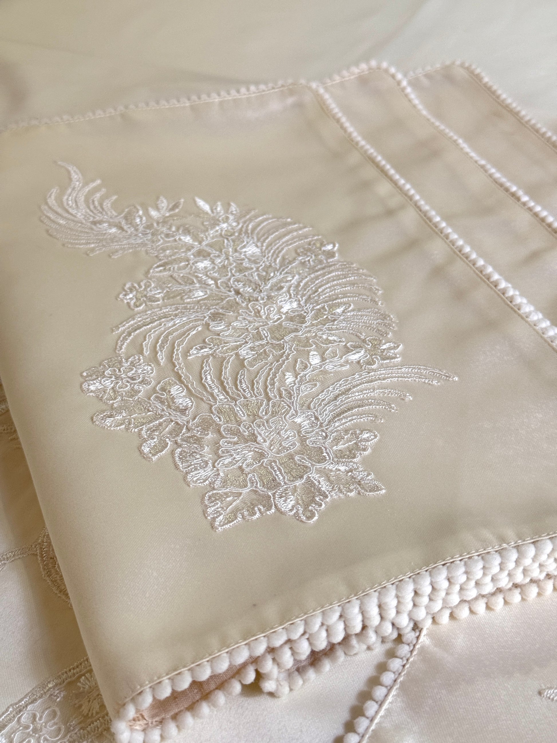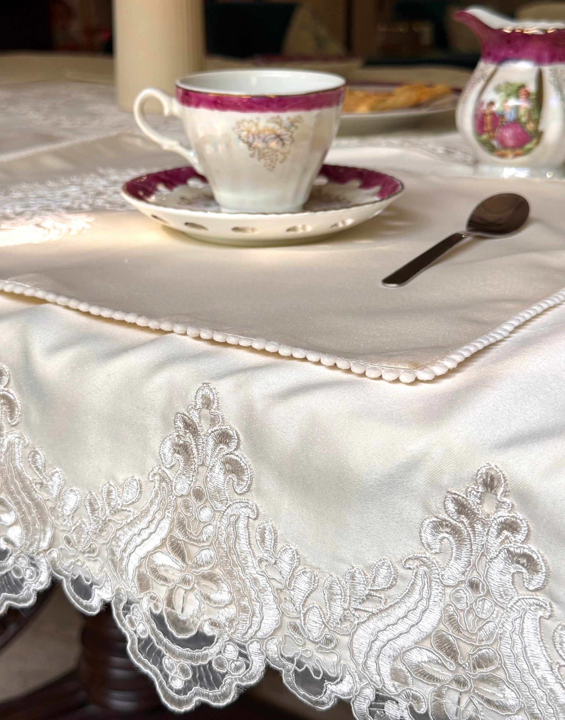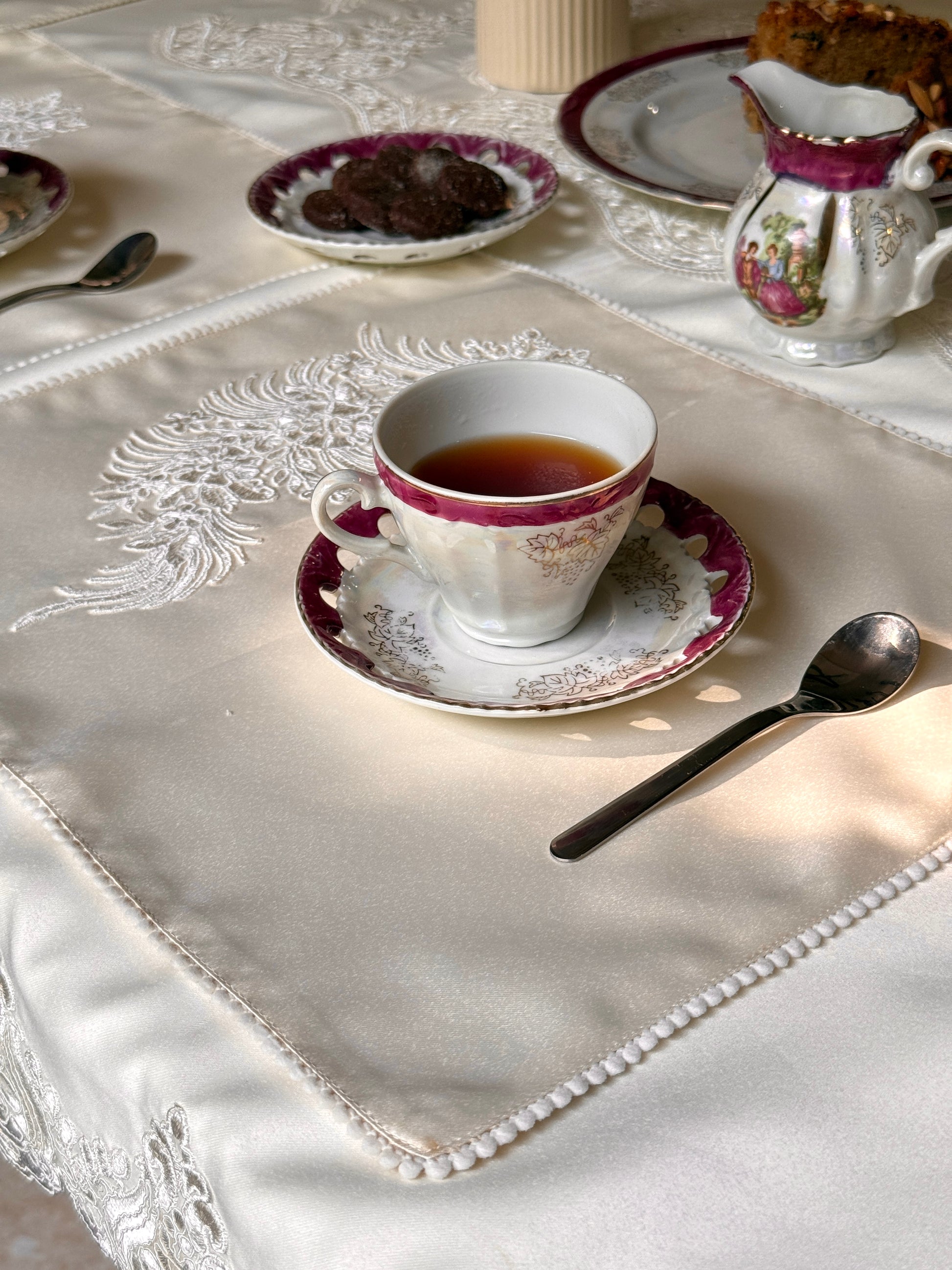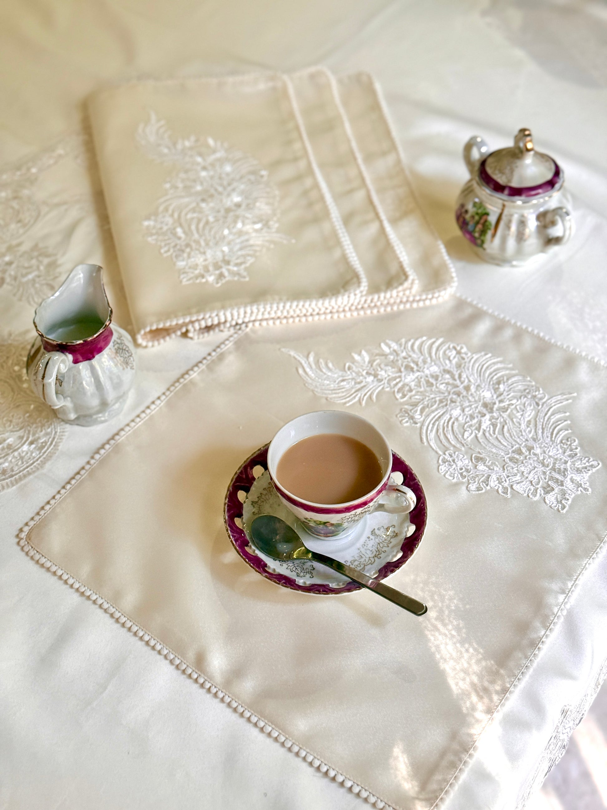 This ivory mat, finished with delicate lace and adorned with monochrome embroidery, is the perfect blend of elegance and style. Subtle yet striking, it adds timeless charm to your table and makes every setting feel effortlessly refined.